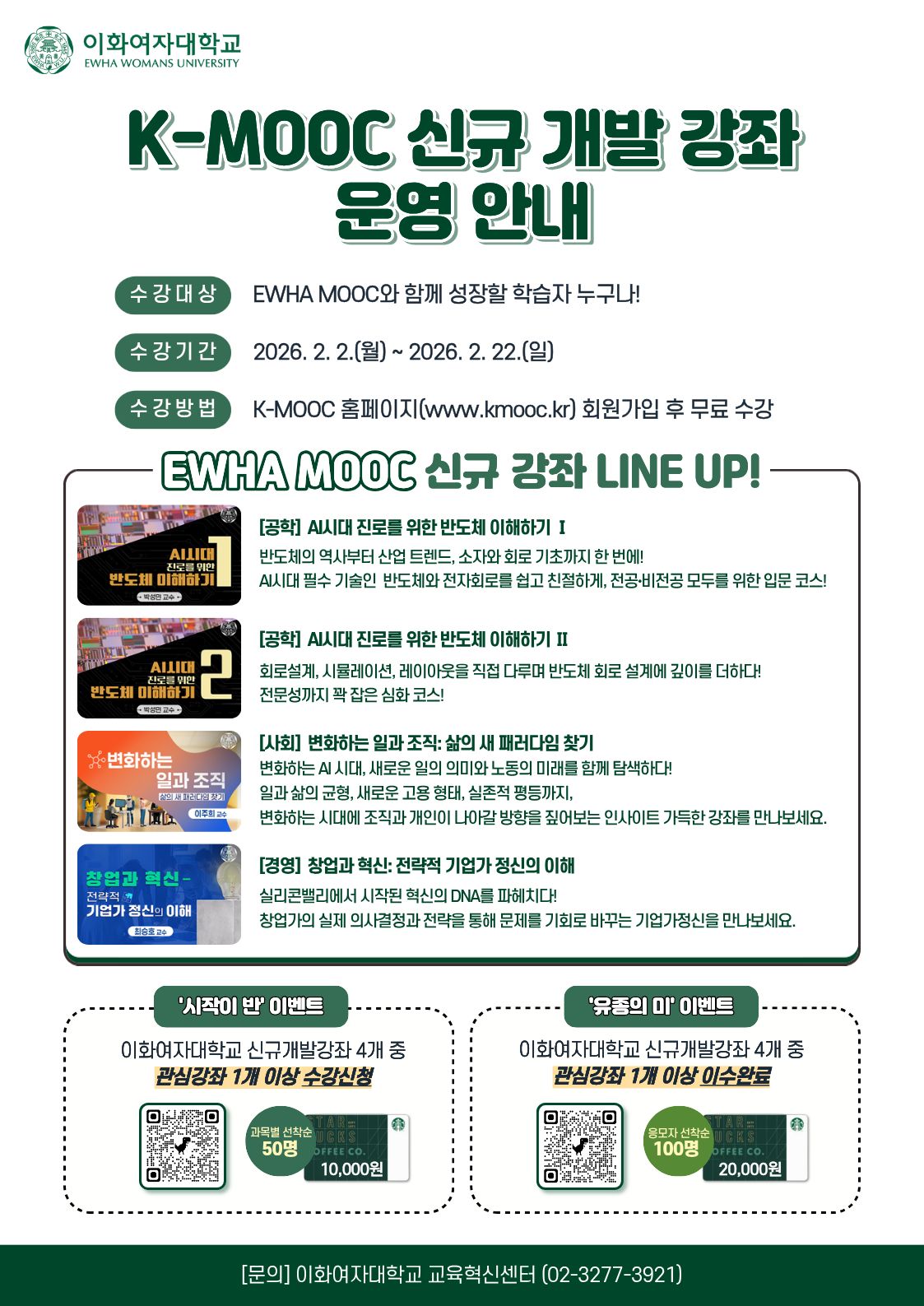 ◈ 2025 EWHA K-MOOC 신규 개발 강좌 수강신청 및 이수 이벤트 (2026.1.19.(월)~2.22.(일))
