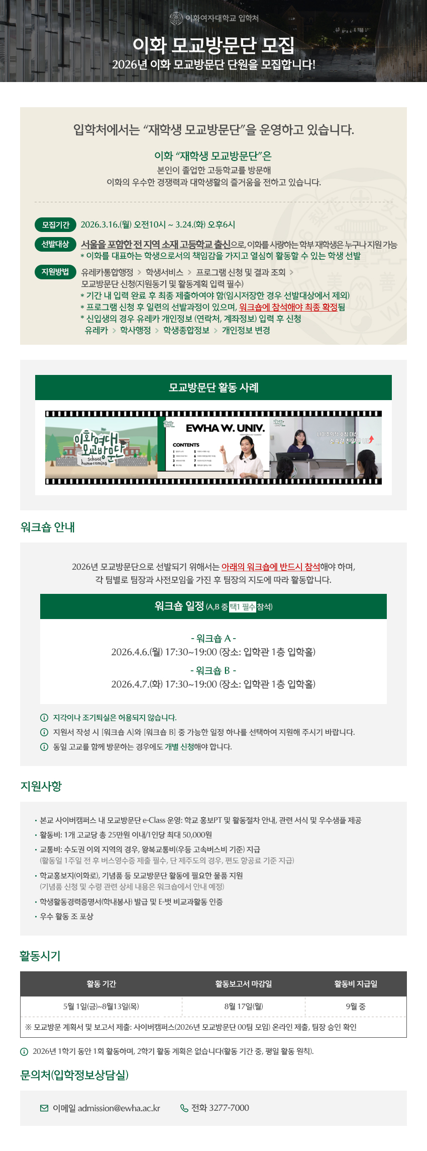 * 모교방문단은 지원 후, 오프라인 워크숍(2회 중 1회)을 반드시 참석해야 최종 선발됩니다.